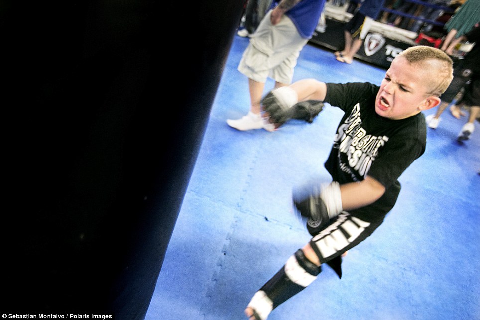Sacramento, California, United States: Mason “The Beast” Bramlette, 7, trains at the Ultimate Fitness Gym before the 2013 California State Pankration Championships Youth Division