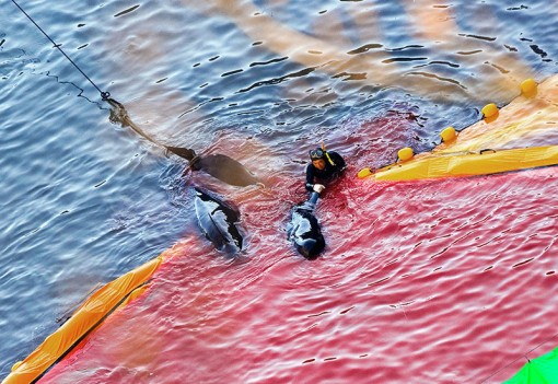 Activists noted that this winter’s Taiji slaughter was one of the largest in years. In all they reported at least 50 “show-quality” specimens would be shipped off to aquariums around the world from China, the Middle East to inland Mexico and beyond. The animals fortunate enough to avoid being killed for their prized meat were released back to sea, where they will spend the rest of their emotionally traumatized lives.