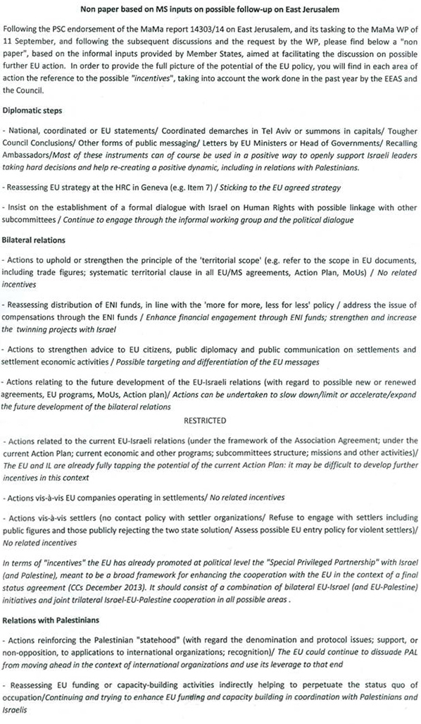 Another incentive in the document is the issuing of statements, coordinated with all 28 EU member states, “to openly support Israeli leaders taking hard decisions and help recreating a positive dynamic, including in relations with the Palestinians.”