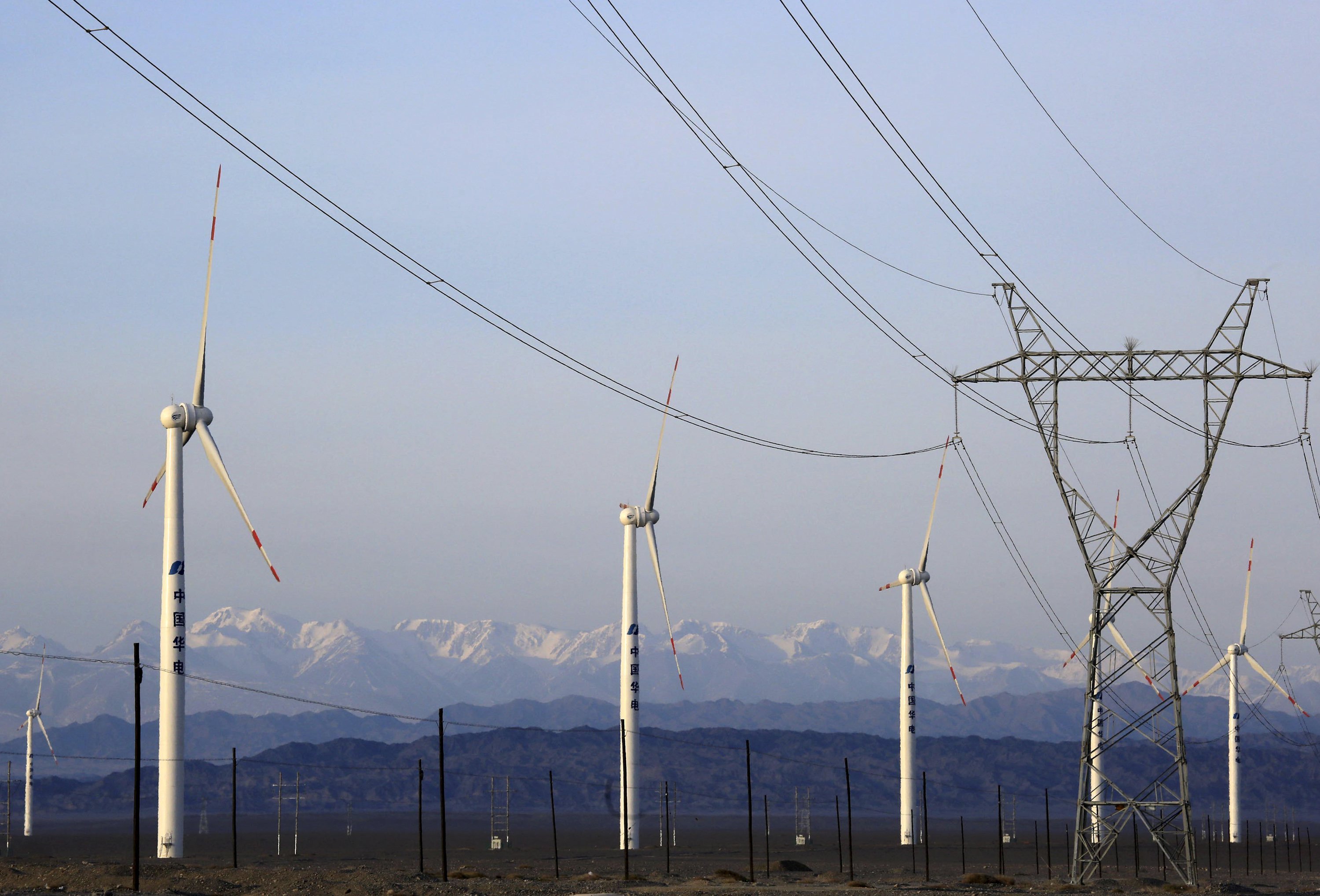 An electricity pylon is seen next to wind turbines at a wind power plant in Hami, Xinjiang Uighur Autonomous Region, China, March 21, 2015. China’s wind farm firms are feeling the heat as state grid operators deliberately delay hooking them up and cut back on purchases, wasting about a fifth of the total wind power output or enough electricity to run Beijing for 40 days. Picture taken March 21, 2015. REUTERS/Stringer