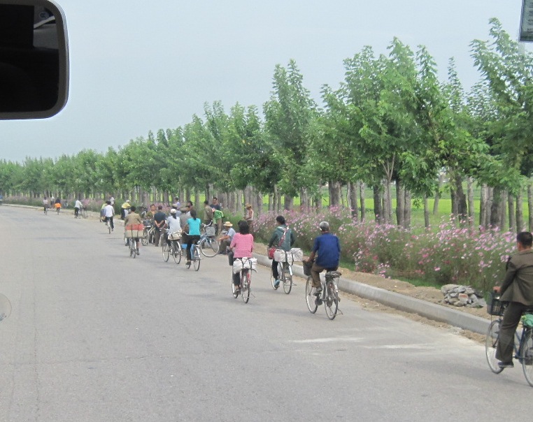 Many people, especially during rush hour, are out walking and riding bicycles, sometimes ferrying a child or large bundles on the rear rack. To prove that not all North Koreans blindly follow the rules, I snapped a photo of a man riding his bicycle the wrong way on a one-way bike lane. An avid cyclist myself, I watched longingly each time we drove past the well-used bicycle trail along the scenic banks of the Taedong River in Pyongyang (no time in our full schedule for us to try it out). And when we headed out of town in our tour bus, the broad, nearly empty, flower-lined highway stretched out before us like another great big bike path!