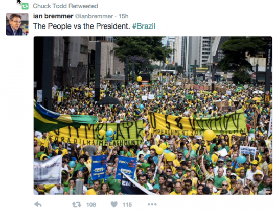 Quando a mídia internacional fala sobre o Brasil, ela tem focado nos crescentes protestos de rua que pedem o impeachment de Rousseff. Essas fontes midiáticas tipicamente mostram os protestos de forma idealizada, com uma certa adoração: como movimentos de massa inspiradores que se levantam contra um regime corrupto. Ontem, Chuck Todd, da NBC News, retuitou Ian Bremmer (do Eurasia Group) descrevendo os protestos anti-Dilma Rousseff como “O Povo contra A Presidente” – um tema fabricado, condizente com o que é noticiado por grupos mídiáticos brasileiros anti-governo, como a Globo: