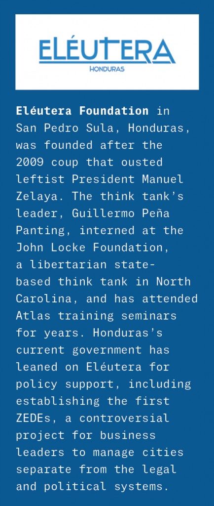 Over the years, Atlas and its affiliated charitable foundations have provided hundreds of grants to conservative and free-market think tanks in Latin America, including the libertarian network that supported the Free Brazil Movement and organizations behind a libertarian push in Argentina, including Fundación Pensar, the Atlas think tank that merged with the political party formed by Mauricio Macri, a businessman who now leads the country. The leaders of the Free Brazil Movement and the founder of Fundación Eléutera in Honduras, an influential post-coup neoliberal think tank, have received financial support from Atlas, and are among the next generation of political operatives that have gone through Atlas’s training seminars.