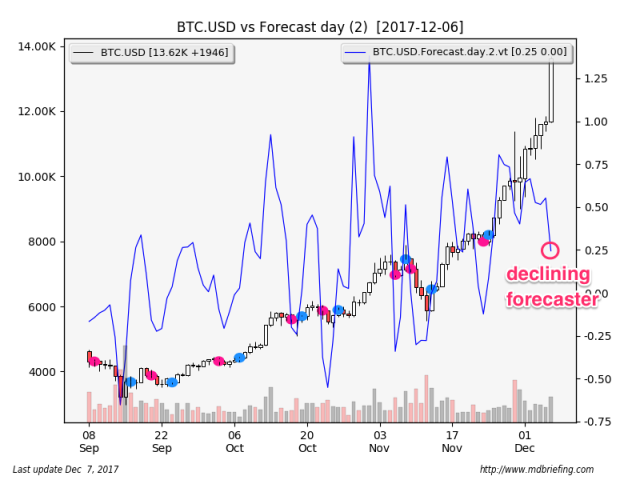 Davefairtex, our resident charting expert, notes that his model now shows Bitcoin’s level of overvaluation at “nosebleed” levels with a daily RSI of over 98 and the forecaster clearly predicting a reversal: