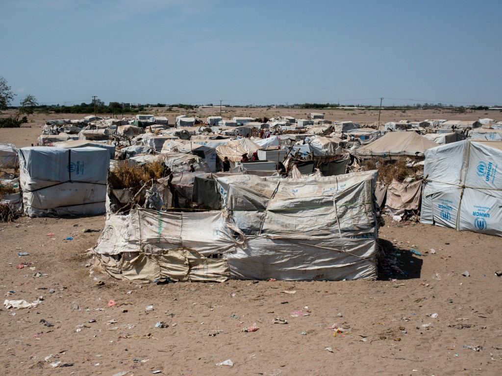 Makeshift tents held together with rope and protected by sticks bake under the sun in Mishqafa camp. Photos: Alex Potter for The Intercept