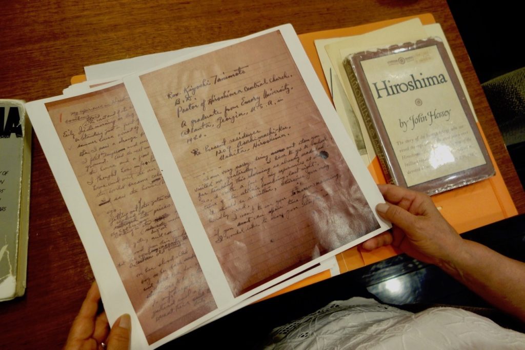 Mrs. Koko Kondo showing the manuscript written by her father, Reverend Kiyoshi Tanimoto, that inspired John Hersey’s classic, Hiroshima.