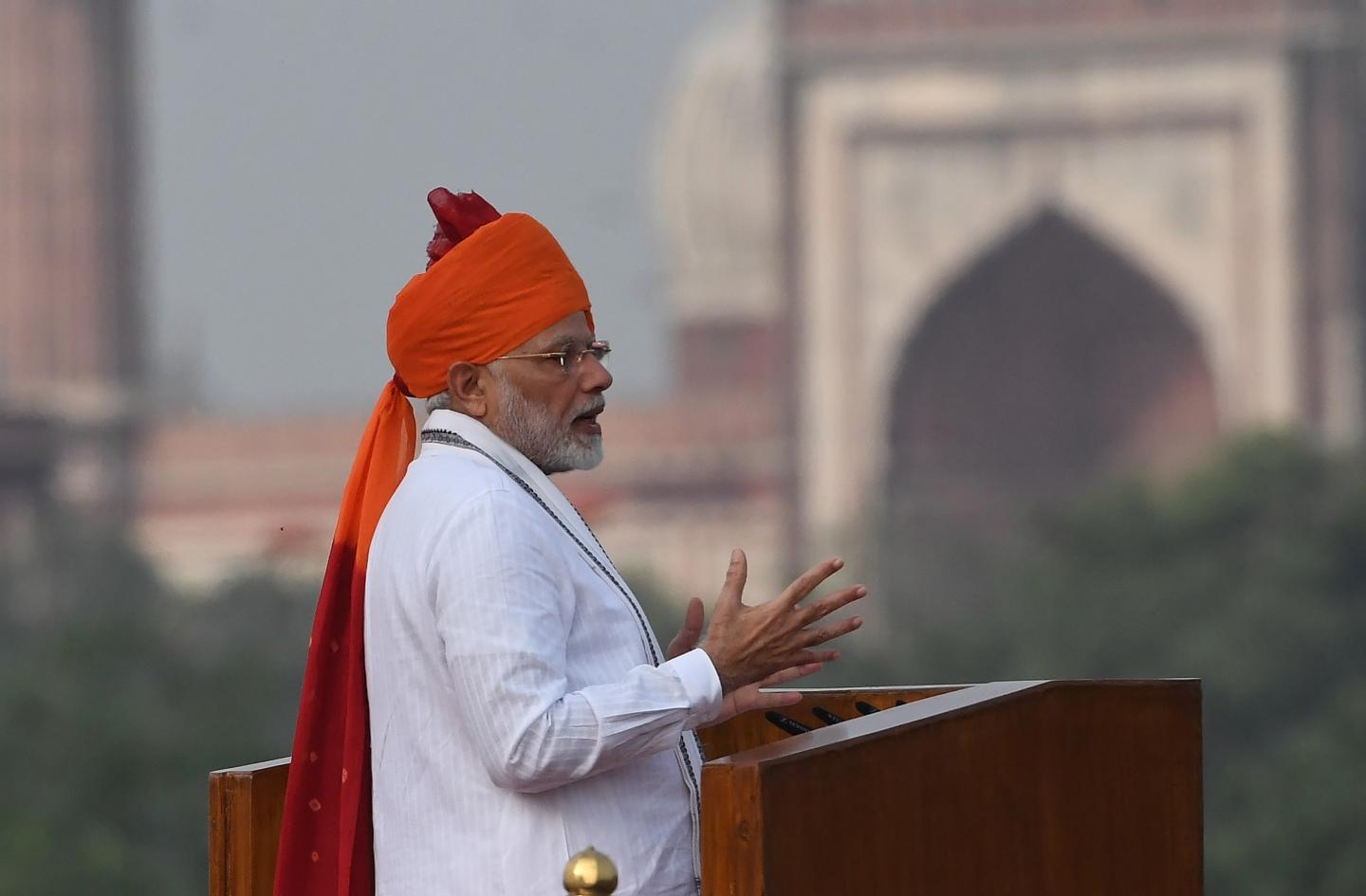 Indian Prime Minister Narendra Modi delivers a speech at the Red Fort in New Delhi, India, on August 15. PRAKASH SINGH/AFP/Getty Images