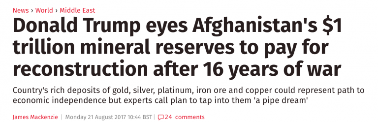 The implication of Trump’s resolve is to plunder and steal Afghanistan’s mineral riches to finance the “reconstruction” of a country destroyed by the US and its allies after 16 years of war, i.e “War reparations” paid to the aggressor nation?
