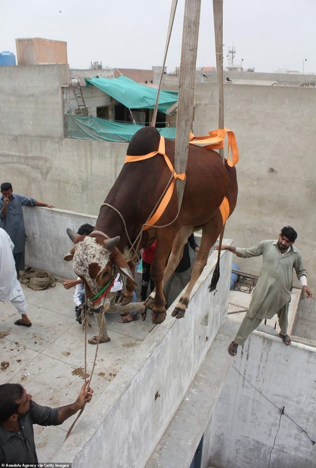 Imagens fortes divulgadas recentemente mostram vacas e bois sendo içados de grandes alturas até o chão, numa operação arriscada e improvisada. Os animais estão sendo levados pelos agricultores paquistaneses, que mantêm seu rebanho no telhado, para o mercado da região de Karachi.