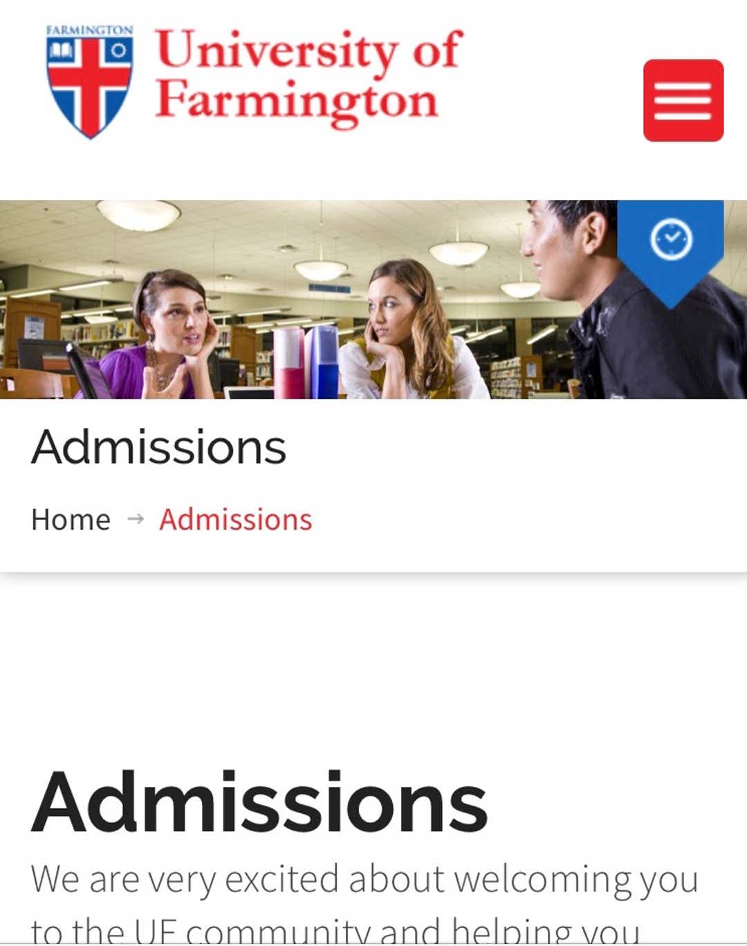 Admissions section of the website of the University of Farmington, a fake university created by ICE and Dept. of Homeland Security. It reads: “We are very excited about welcoming you to the UF community and helping you”. Department of Homeland Security