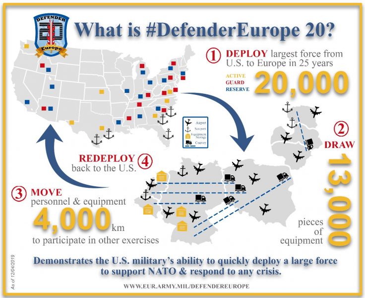 La pianificazione della Defender Europe 20, precisa il Pentagono, resta però immutata. In altre parole, 30.000 soldati Usa si eserciteranno a difendere l’Europa da una aggressione russa, scenario che mai potrebbe verificarsi anche perché nello scontro si userebbero non carri armati ma missili nucleari.