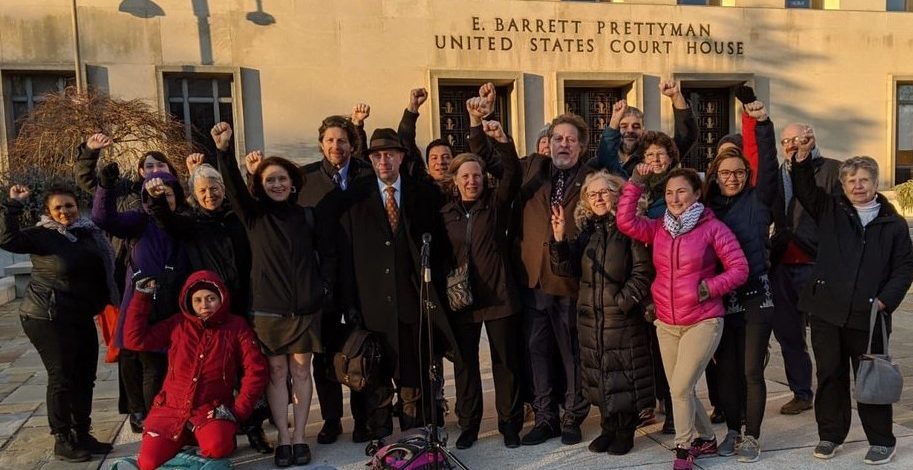 Embassy protectors [left to right: David Paul, Margaret Flowers, Adrienne Pine, Kevin Zeese] outside of court on February 13, 2020, by Martha Allen.
