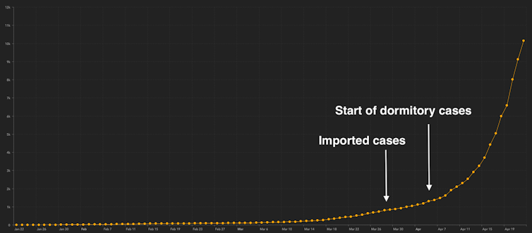 Next, an even greater proliferation in the last two weeks came came from the dormitories where migrant workers live in tightly packed quarters. Cases in these dorms continue to rise even as the government does extensive testing, introduces quarantine procedures, and builds new accommodation for the virus-free and beds for the infected. As of April 22, 8,094 out of the total of 10,141 cases were dormitory residents, with a single dormitory accounting for 22% of all cases in the country.