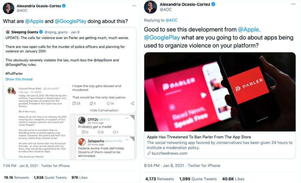 This dynamic has become so common that Democrats now openly pressure Silicon Valley companies to censor content they dislike. In the immediate aftermath of the January 6 Capitol riot, when it was falsely claimed that Parler was the key online venue for the riot’s planning — Facebook, Google’s YouTube and Facebook’s Instagram were all more significant — two of the most prominent Democratic House members, Rep. Alexandria Ocasio-Cortez (D-NY) and Rep. Ro Khanna (D-CA), used their large social media platforms to insist that Silicon Valley monopolies remove Parler from their app stores and hosting services: