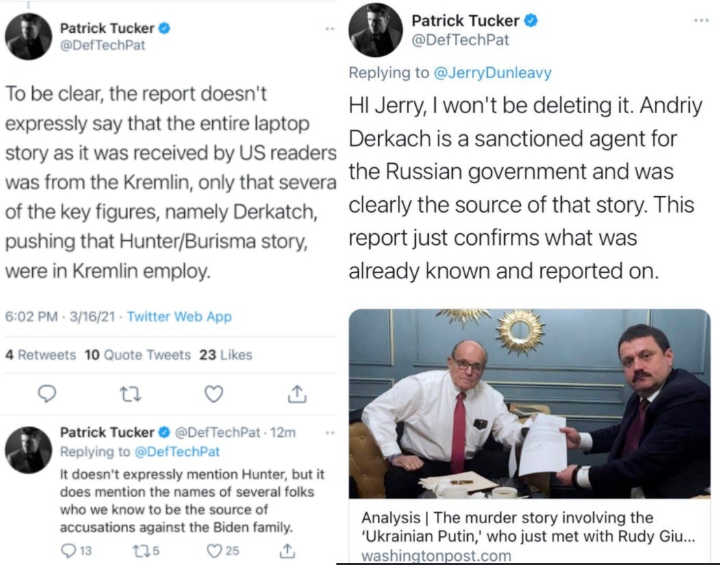 I've deleted a tweet that suggested that a recent ODNI report made explicit reference to the Hunter Biden laptop story. It makes reference to Andrii Derkach, a pro-Russian Ukrainian politician who was trafficking information remarkably similar to what showed up in the Post report