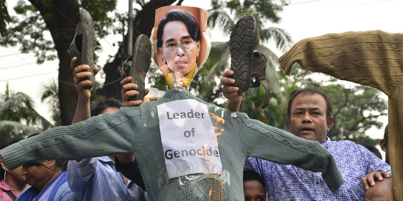 A Bangladeshi activist burn effigy of Myanmar’s State Counsellor Aung San Suu Kyi during a protest to stop the Genocide on Rohingya in Myanmar, in Dhaka, Bangladesh, on September 15, 2017. Photo: Mamunur Rashid / Shutterstock.com
