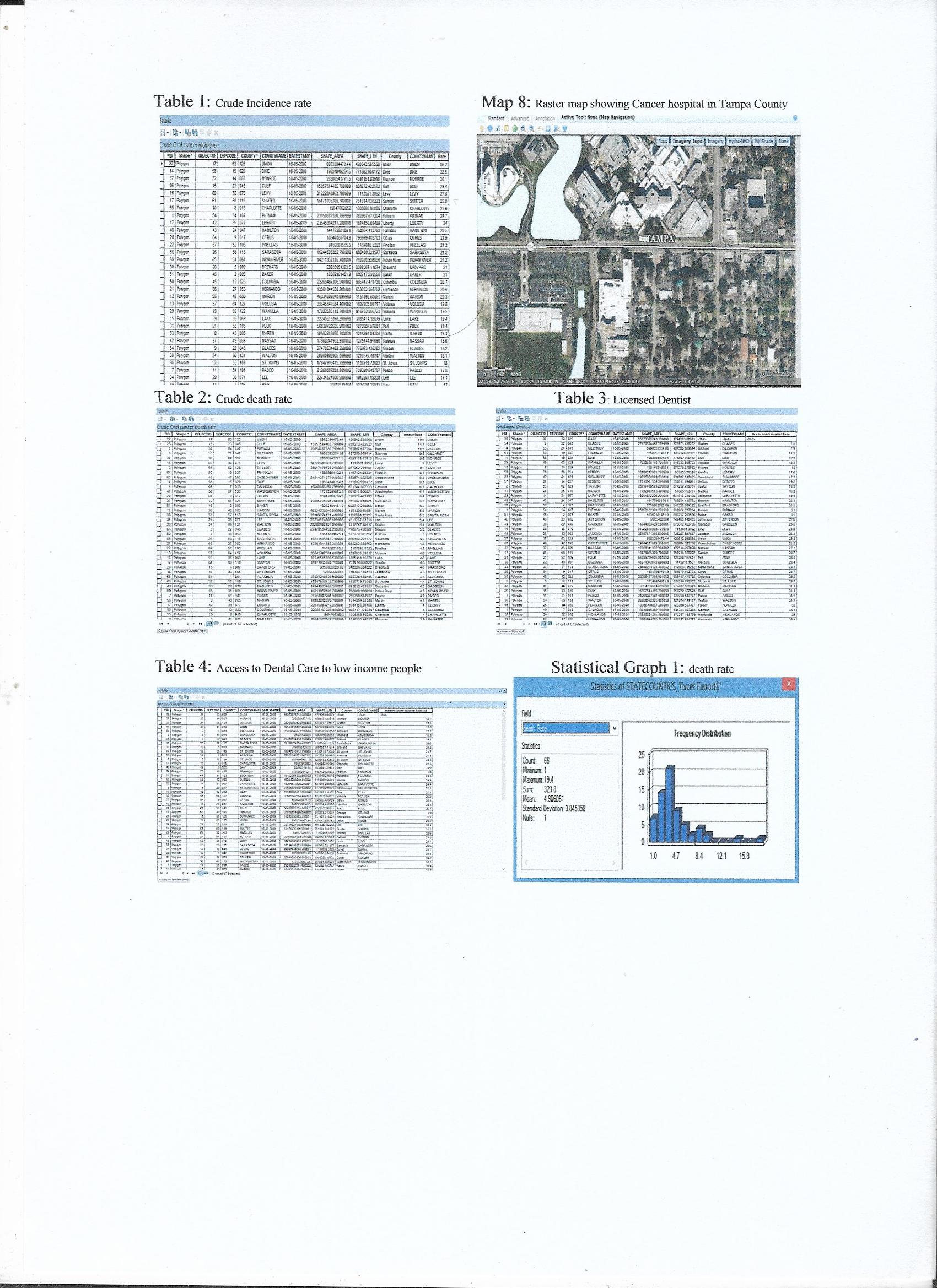 Steps in data preparation: At first the Florida map shape file was downloaded and stored in the project folder. The data was obtained from Florida Department of Health, Division of Public Health Statistics & Performance Management. The data related to oral cancer crude incidence rate and crude death rate in 2009 to 2011 in Florida was downloaded as an excel file. The Excel file contained some unnecessary text that need to be edited, so the cleanup of the data was done by removing some of the columns and capitalizing the county name to match with the county name in the attribute table of the map layer. The map displayed has rates and not the count, as rate are more logical to compare, so the column of counts has been removed from the excel file. Similarly, the data related to the rate of access to dental care for low-income people and percentage of licensed dentist in 2009 to 2011 data was obtained and cleaned. The project datasets are then transferred to a new geodatabase. Then the data was joined to Florida map using county name as a common field in the layer and table. After creating a join using Arc Map (Map1 and Map2) was build having two maps showing incidence and death rates using choropleth map design and one with pie charts. The (map 3) was based on a comparison of licence dentist to incidence rate using choropleth map showing incidence and licensed dentist with gradual symbol map. Similarly the (map 4) was made to demonstrate the incidence rate and access to dental care to low-income people. (Map 5 and 6) was created using the Florida Cancer Data System online showing age-adjusted incidence rate of oral cancer in 2009 at ten anatomical sites of oral and pharyngeal structure in both the sexes concerning (map 5) for Blacks and (map 6) for Whites. For (Map7) the excel file was created using the Google map and finding the address of cancer hospitals. Excel file with address, zip code was created, then with zip code the address were geocoded and mapped.