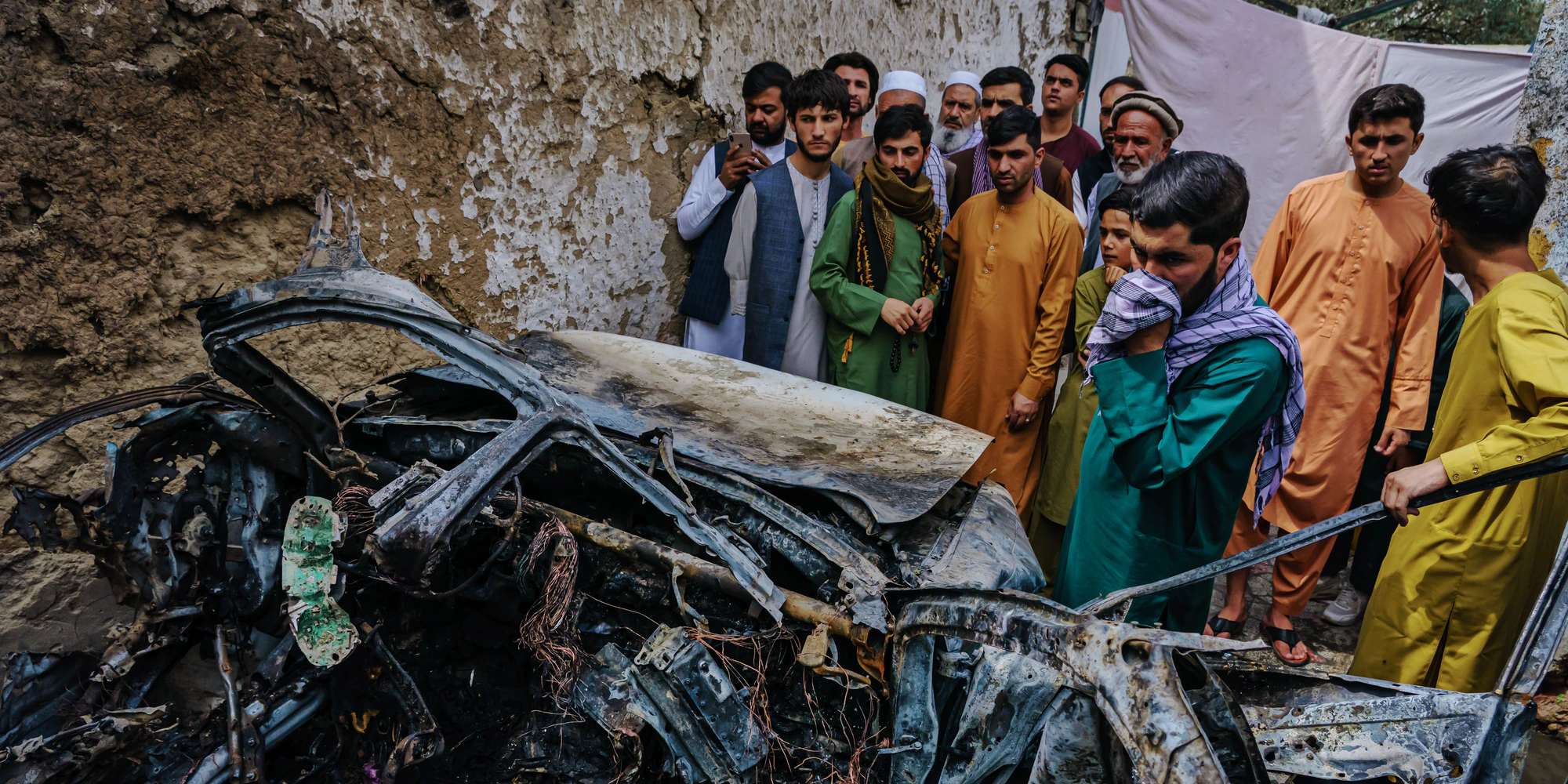 Relatives and neighbors of the Ahmadi family gathered around the incinerated husk of a vehicle targeted and hit by a U.S. drone strike that killed 10 civilians including 7 children, in Kabul, Afghanistan, on Aug. 30, 2021. Photo: Marcus Yam/Los Angeles Times via Getty Image