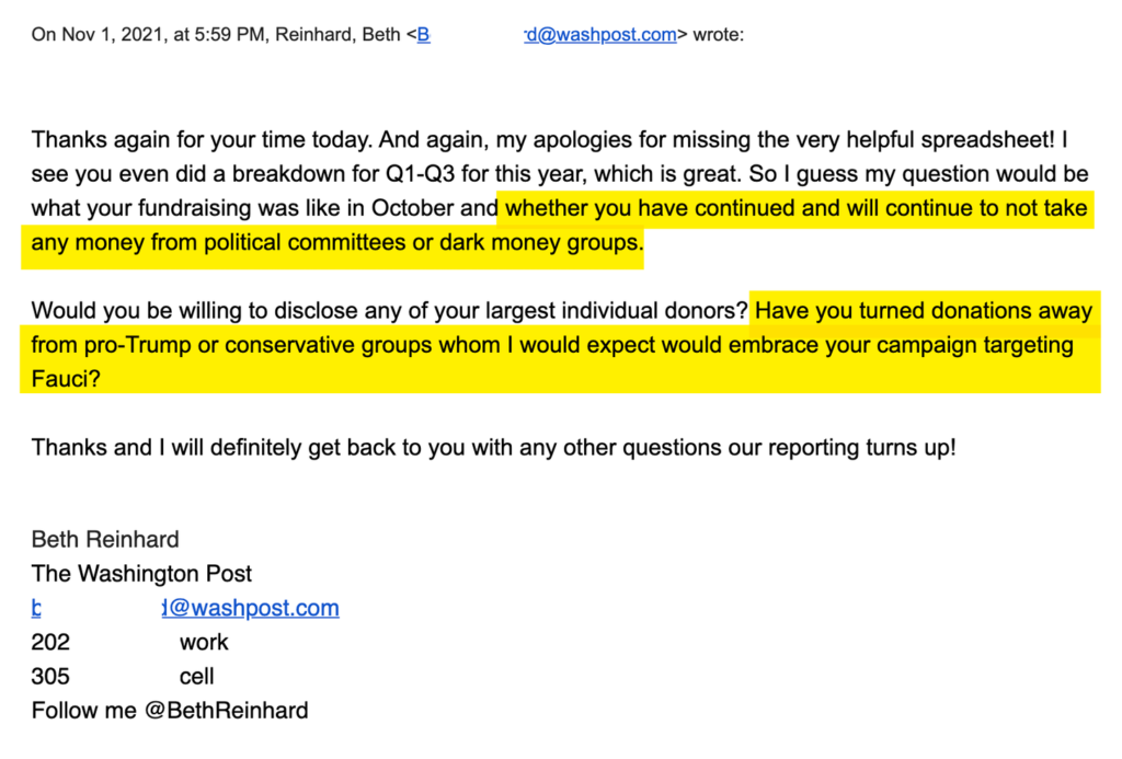 Once The Post was repeatedly thwarted in its efforts to concoct the lie that the group is MAGA-funded, Reinhard continued to insist that there must be hidden right-wing funding sources, and even began demanding that White Coat take some sort of bizarre vow never to accept right-wing or “pro-Trump” funding sources in the future. On Monday, she sent them this flailing email: