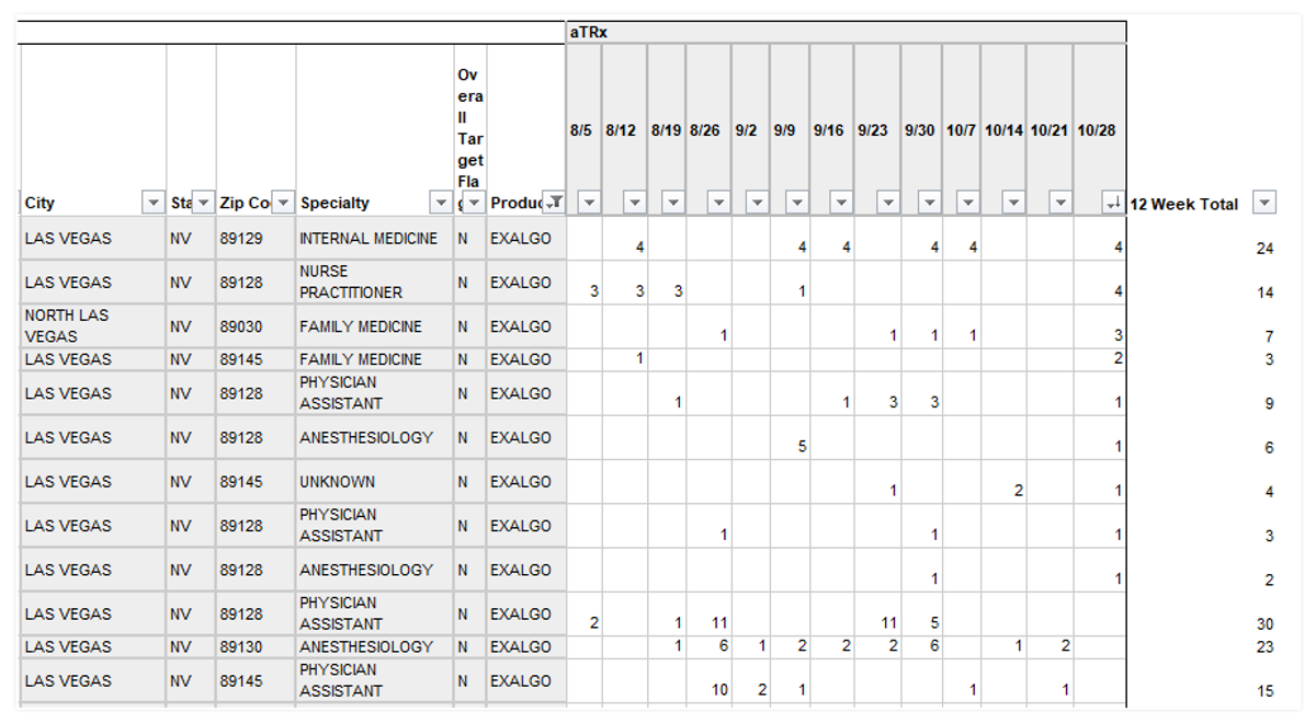 The following chart was put together for Covidien about Exalgo. For every doctor in the Las Vegas region, it shows their prescribing, by week, of the drug and notes whether they are a “target.”