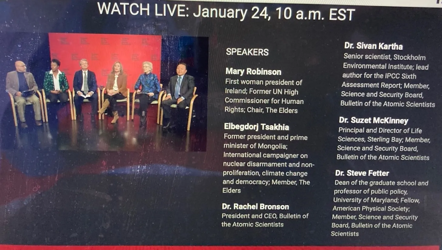 Mary Robinson remarked that when the Doomsday Clock was last set at 100 seconds to midnight, she did not imagine the “gathering storm” that now includes a pandemic and war in Ukraine. We now have “extinction level threats, interlocking crises, unwillingness of leaders to work in the long-term interests of their people.”