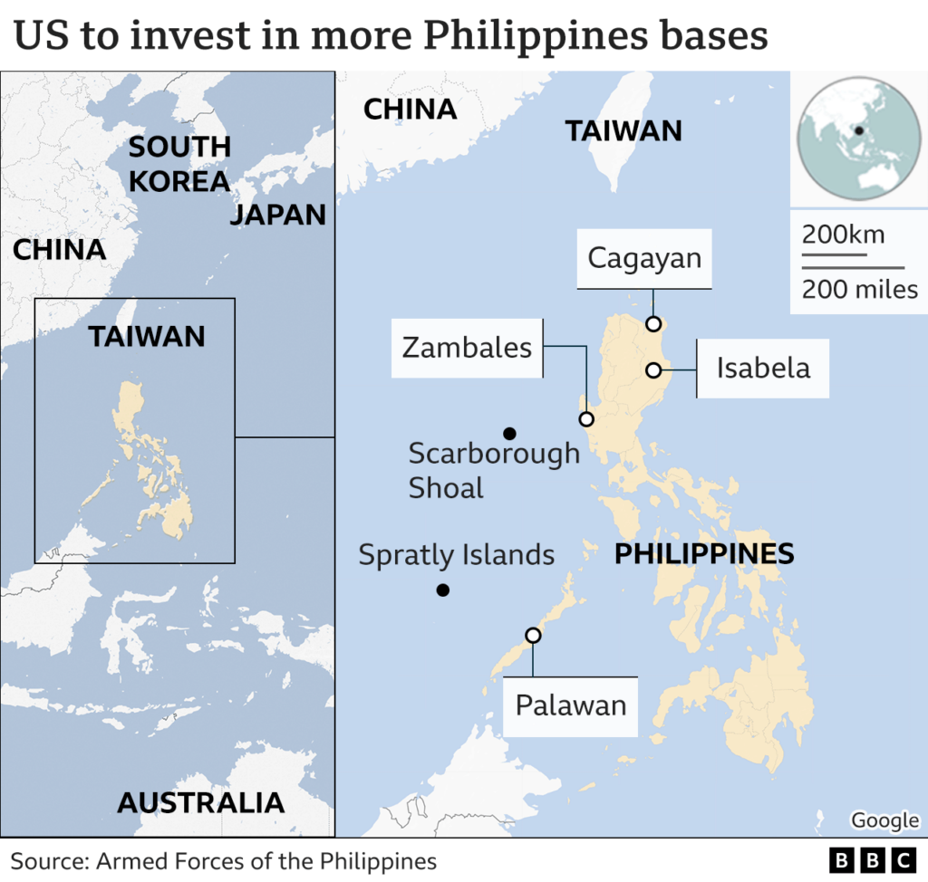 “The US hasn’t said where the new bases are but three of them could be on Luzon, an island on the northern edge of the Philippines, the only large piece of land close to Taiwan – if you don’t count China,” writes Wingfield-Hayes.