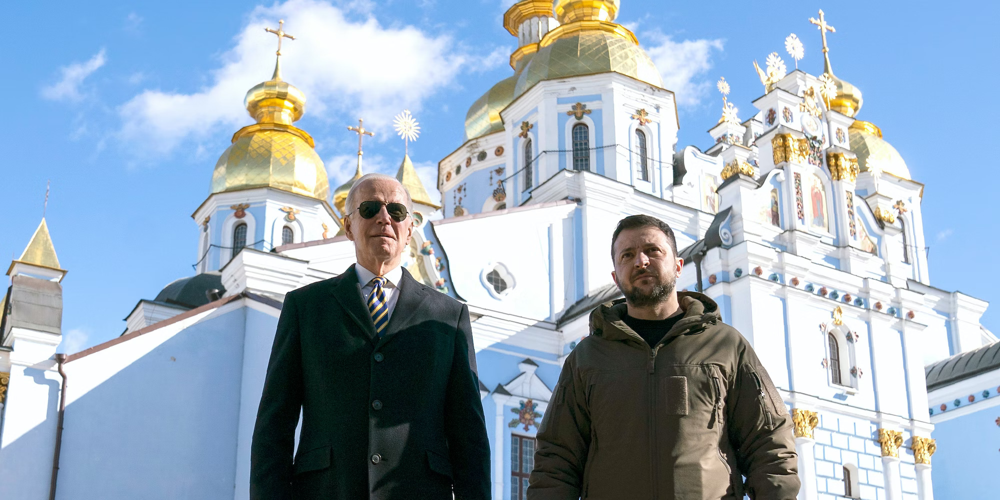 President Joe Biden walks with Ukrainian President Volodymyr Zelenskyy, in Kyiv, on Feb. 20, 2023. Photo: Evan Vucci/AP