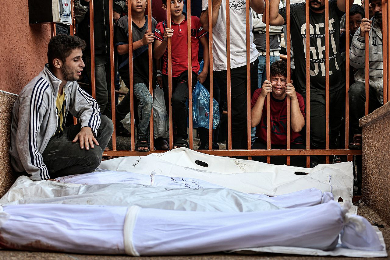 Al-Nasser Hospital in Khan Younis overflows with the bodies of Palestinians killed and wounded overnight in Israeli airstrikes, Gaza Strip, 25 Oct 2023. (Mohammed Zaanoun/Activestills)