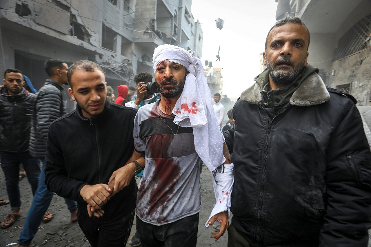Palestinians walk next to the rubble of buildings destroyed by Israeli airstrikes in Khan Younis, southern Gaza Strip, 28 Nov 2023. (Atia Mohammed/Flash90)