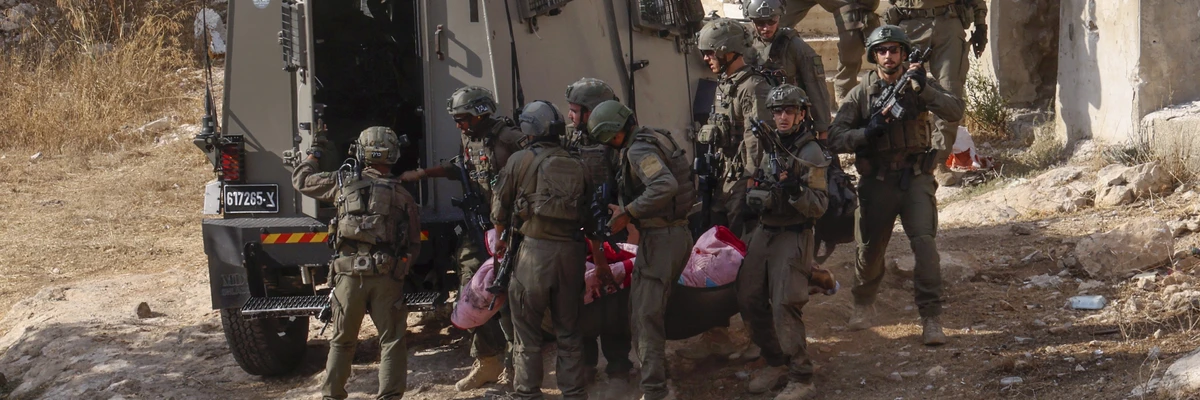 Israeli forces are pictured moving the body of a Palestinian man during a raid in the West Bank city of Hebron on 1 Sep 2024. (Photo: Hazem Bader/AFP via Getty Images)