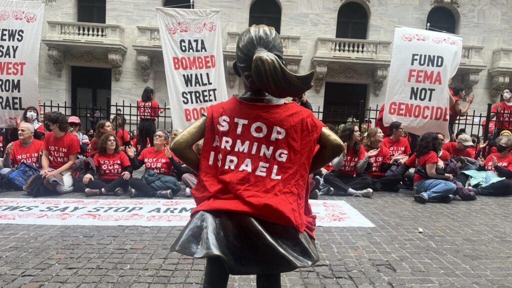 Clad in red t-shirts bearing the messages “Not in our name” and “Jews says stop arming Israel,” protesters chanted “Endless war, profits soar” and carried signs that read “Gaza bombed, Wall Street booms,” “Fund FEMA, not genocide,” and “Jews say divest from Israel.”