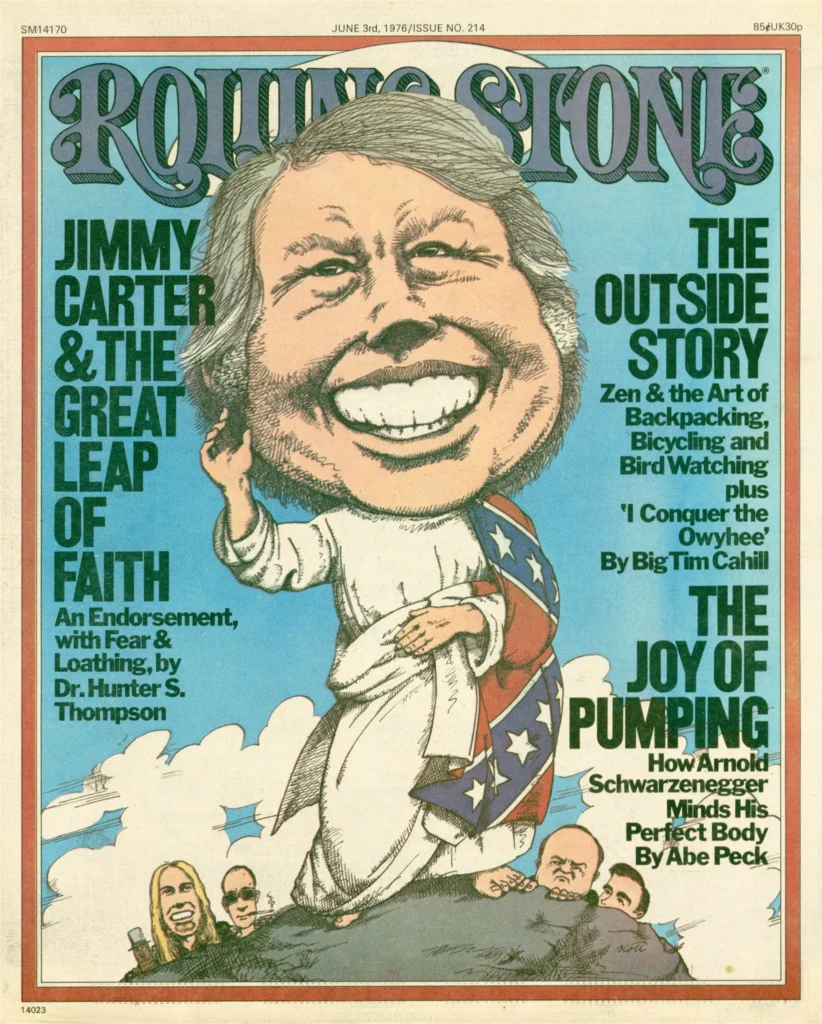 Though he was a long shot, Carter’s relentless campaigning and honest man-of-the-people message landed him the 1976 Democratic presidential nomination. Rolling Stone endorsed Carter with a cover story written by Hunter S. Thompson, who met the future president in 1974 when he gave what Thompson described as a “king hell bastard of a speech” about how the judicial system had failed minorities. “Hunter was my good buddy,” Carter said in 2007 when asked by Tom Brokawabout his relationship with the gonzo journalist. So too were Willie Nelson, Gregg Allman, and Bob Dylan, the latter Carter referred to in that speech as a “poet” who aided his “understanding of what’s right and wrong in this society.”