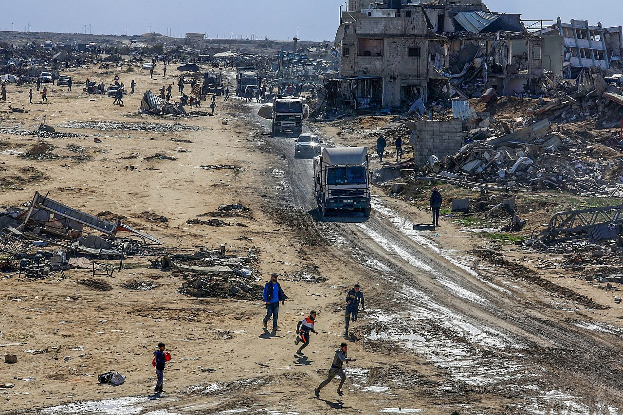 Trucks loaded with humanitarian aid entering Gaza through the Israeli Kerem Shalom Crossing, near Rafah in the southern Gaza Strip, 23 Jan 2025. (Abed Rahim Khatib/Flash90)