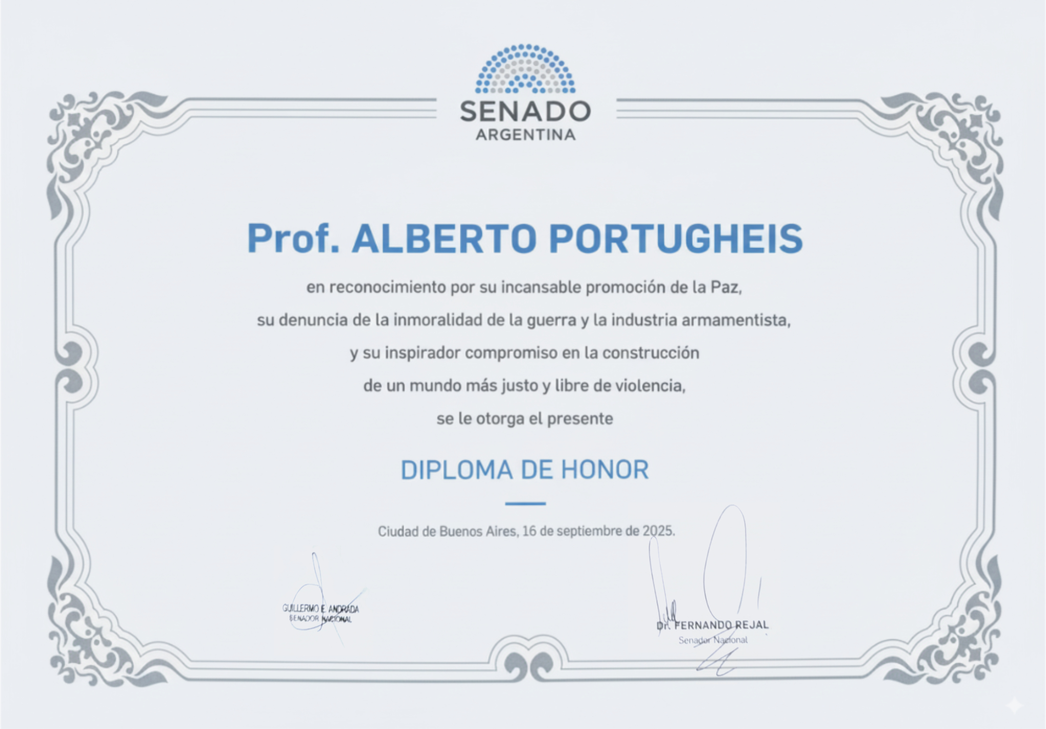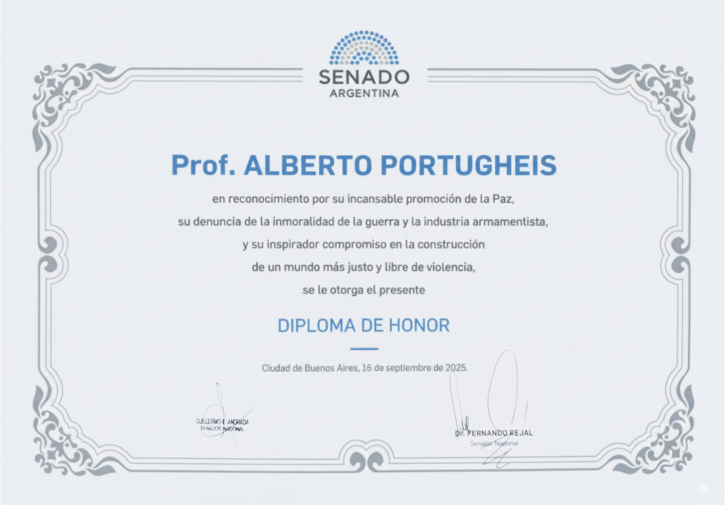 In recognition of his tireless promotion of Peace, his denunciation of the immorality of war and the arms industry, and his inspiring commitment to building a fairer and violence-free world, is hereby awarded this DIPLOMA OF HONOR.