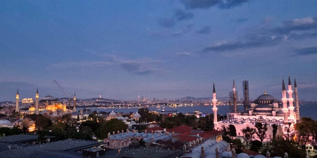A view of Istanbul at dusk, from European side overlooking the Asia side across the Sea of Mamara, with two magnificent landmarks. Photo by Zarni, 23 Oct 2025