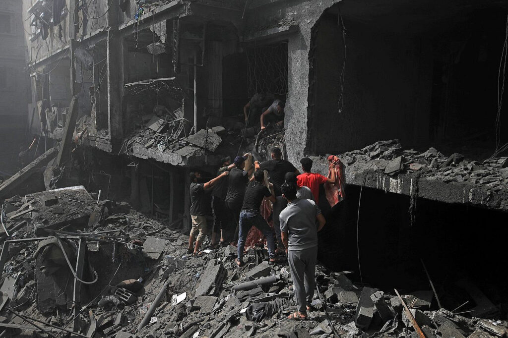 Palestinians try to rescue survivors and pull bodies from the rubble after Israeli airstrikes hit buildings near Al-Aqsa Martyrs Hospital in Deir al-Balah, central Gaza, 22 Oct 2024.