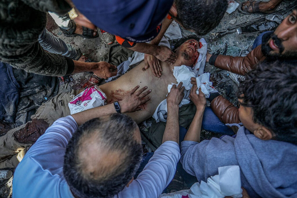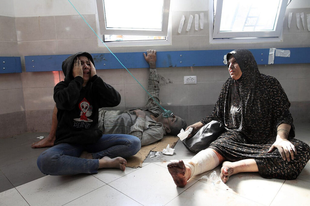 Wounded Palestinians are treated on the floor due to overcrowding at Al-Shifa Hospital, central Gaza Strip, 18 Oct 2024. (Mohammed Zaanoun/Activestills)
