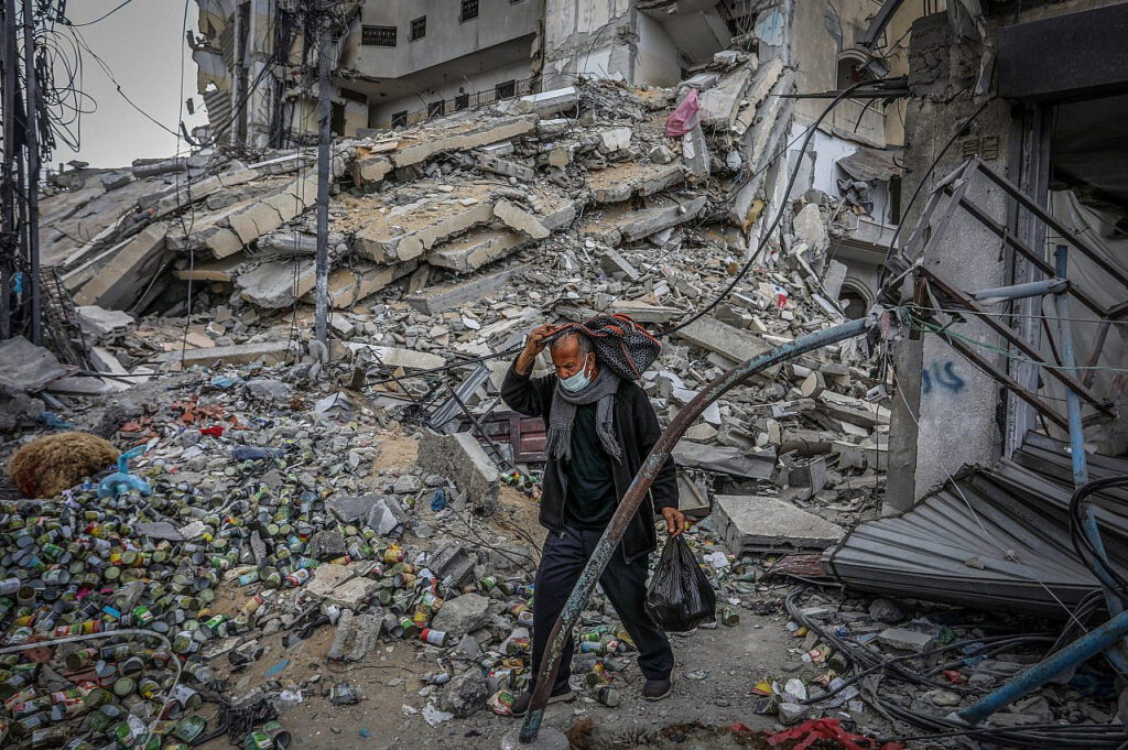 Massive destruction is seen in Al-Rimal popular district of Gaza City after it was targeted by airstrikes carried out by Israeli forces, 10 Oct 2024. (Mohammed Zaanoun/Activestills)