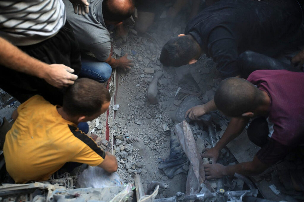 Palestinians digging out with bare hands a body in the rubble after an Israeli airstrike that killed dozens of Palestinians in the middle of Al-Maghazi refugee camp, central Gaza Strip, 5 Nov 2024. (Mohammed Zaanoun/Activestills)