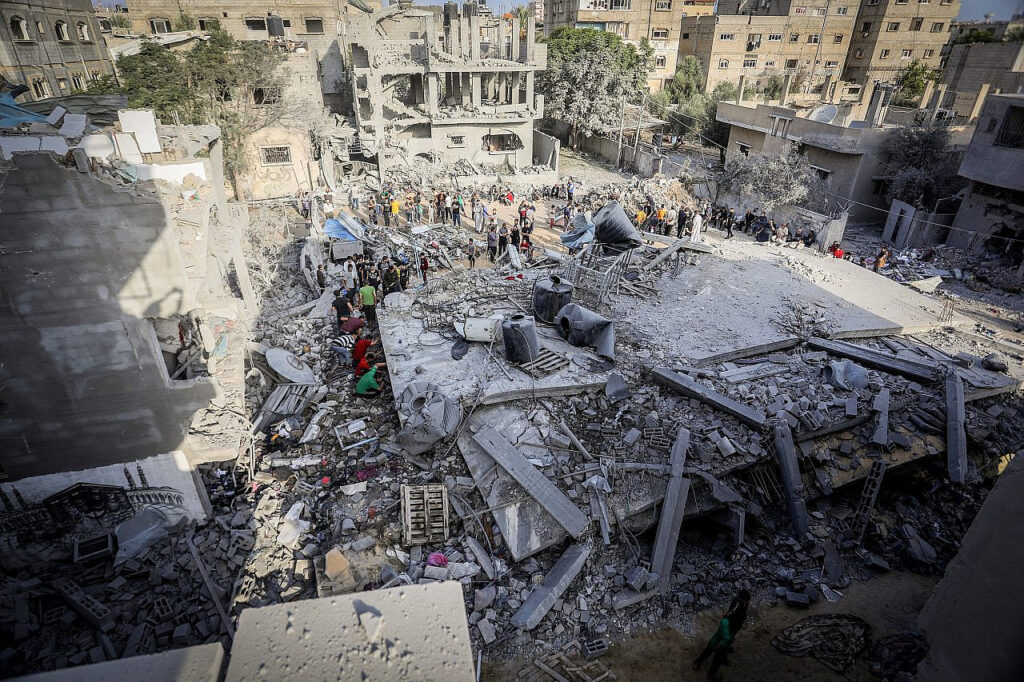 Palestinians inspect their homes and try to rescue their relatives from under the rubble after an Israeli airstrike in the city of Rafah, southern Gaza Strip, 22 Oct 2024.