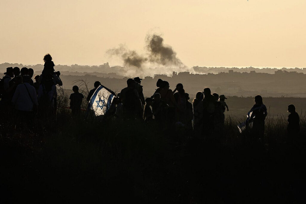 Smoke rises following an Israeli military strike in Gaza City, as seen from the central Gaza Strip, 6 Oct 2025. (Ali Hassan/Flash90)