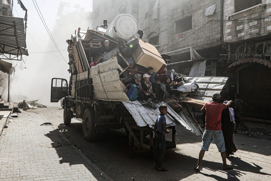Palestinians load a truck with their belongings as they are forced to flee their homes in Al-Shati refugee camp, Gaza City, 23 Sep 2025. (Yousef Zaanoun/Activestills)