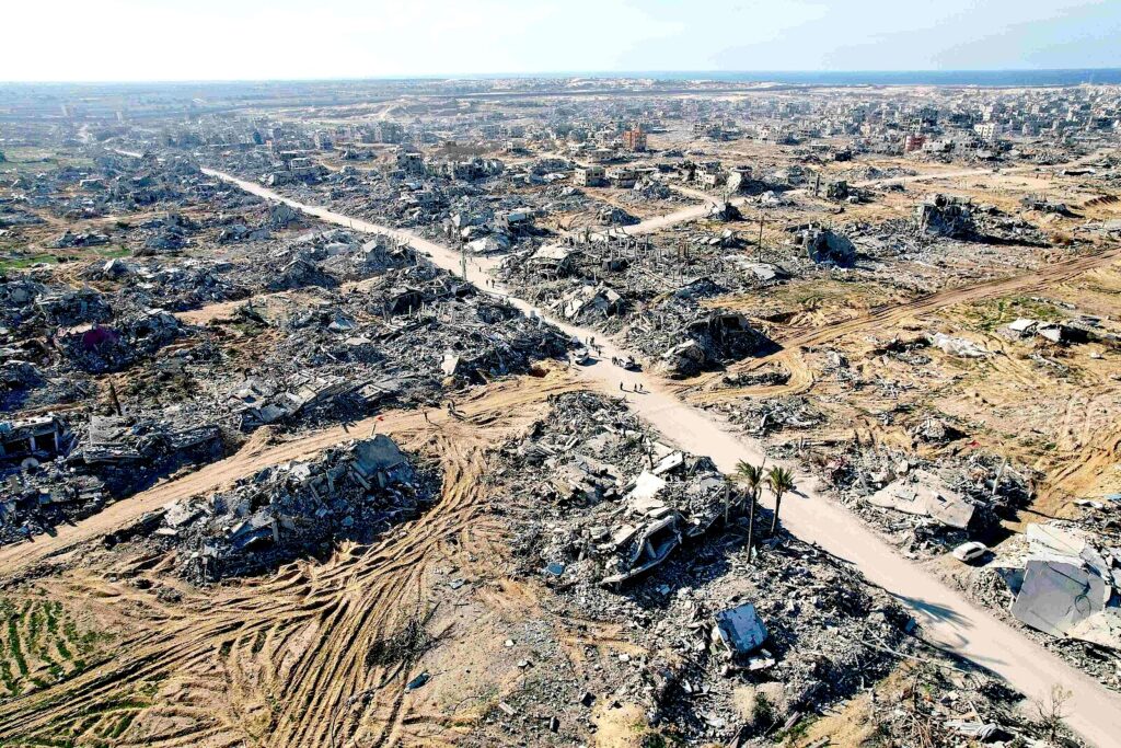 An aerial view of destroyed residential buildings in the Tel Al-Sultan neighborhood, following the withdrawal of the Israeli army during a ceasefire, Rafah, southern Gaza Strip, Sep 2025.