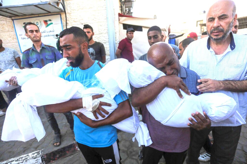 Palestinian men mourn babies–family members–killed in the Israeli bombing of the Nuseirat refugee camp, Gaza Strip, 10 Aug 2025. (UNRWA /Wikimedia Commons / CC BY-SA 4.0)