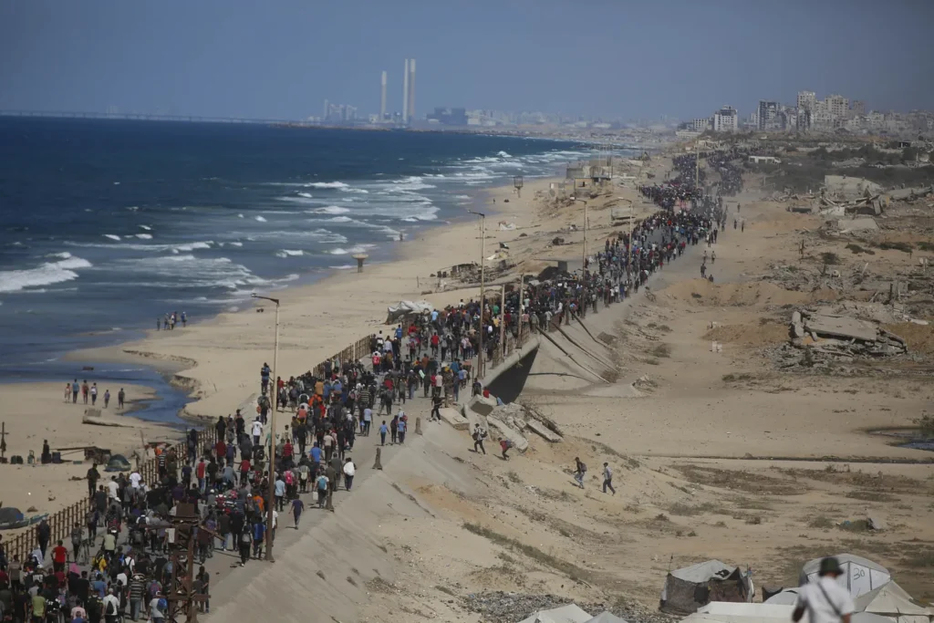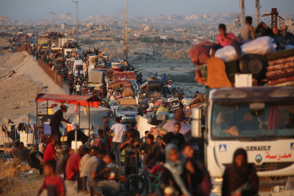Evacuees fleeing south from Gaza City move along the coastal road in Nuseirat in the central Gaza Strip on 17 Sep 2025. (Ali Hassan/Flash90)