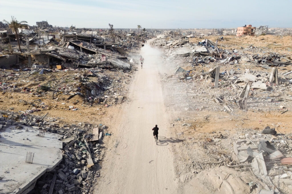 An aerial view showing destruction in Rafah, in the Gaza Strip, after Israeli forces withdrawal and as a temporary ceasefire took hold, 21 Jan 2025.