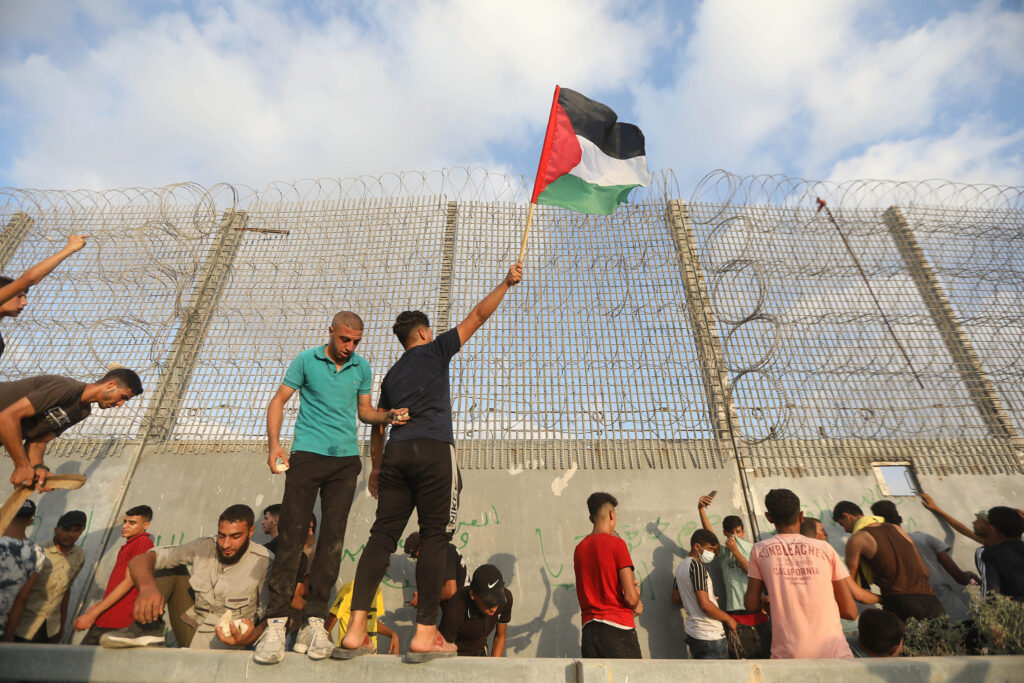 Palestinians protest in front of the fence encaging the Gaza Strip, 21 Aug 2025.