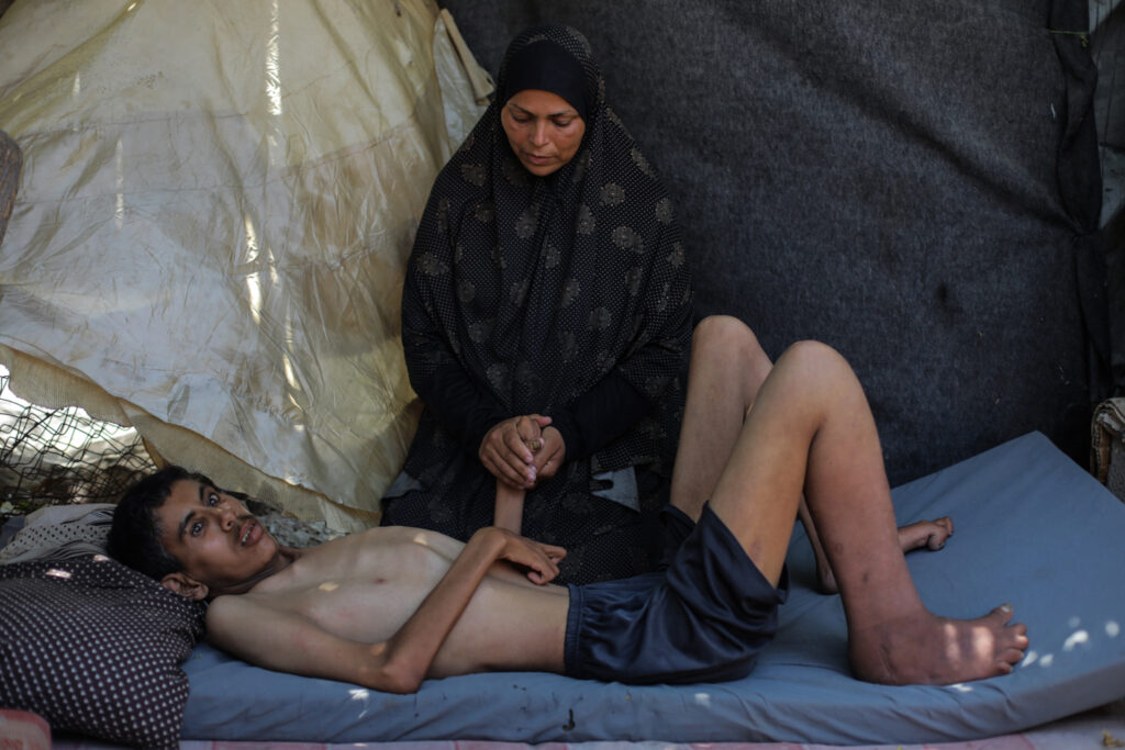 Hamza Mishmish, 25, from the Nuseirat refugee camp, suffers from malnutrition and bone atrophy due to severe food shortages, seen at his tent in the central Gaza Strip, 27 Jul 2025.