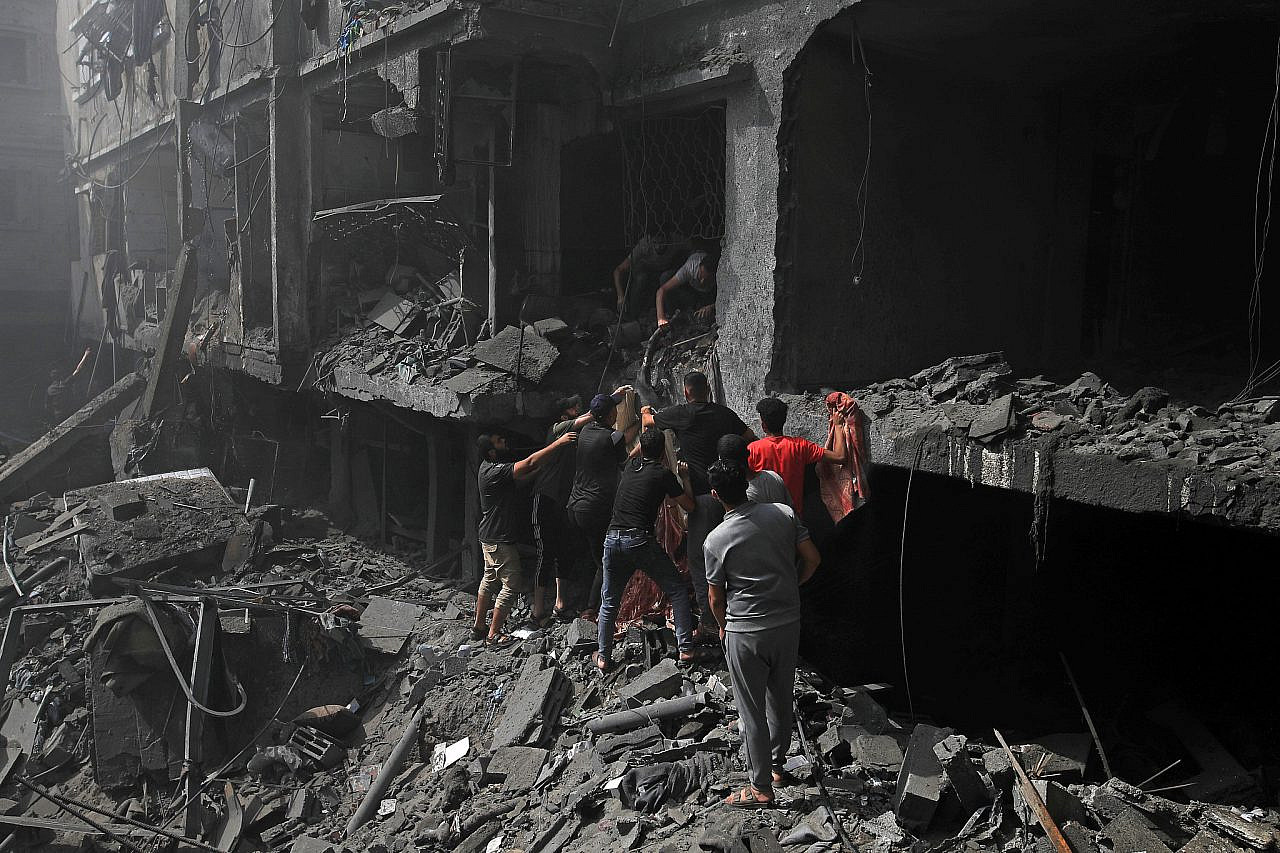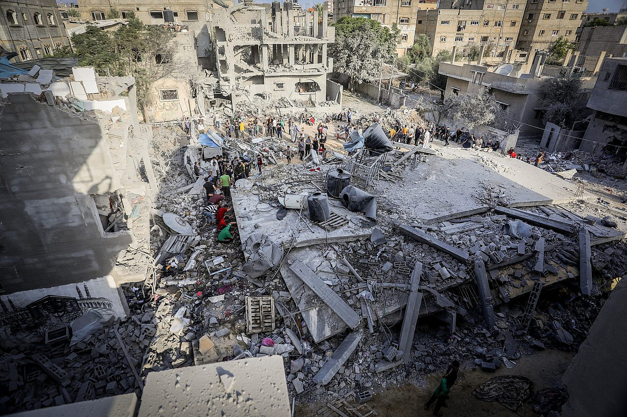 Massive destruction is seen in Al-Rimal popular district of Gaza City after it was targeted by airstrikes carried out by Israeli forces, 10 Oct 2024. (Mohammed Zaanoun/Activestills)