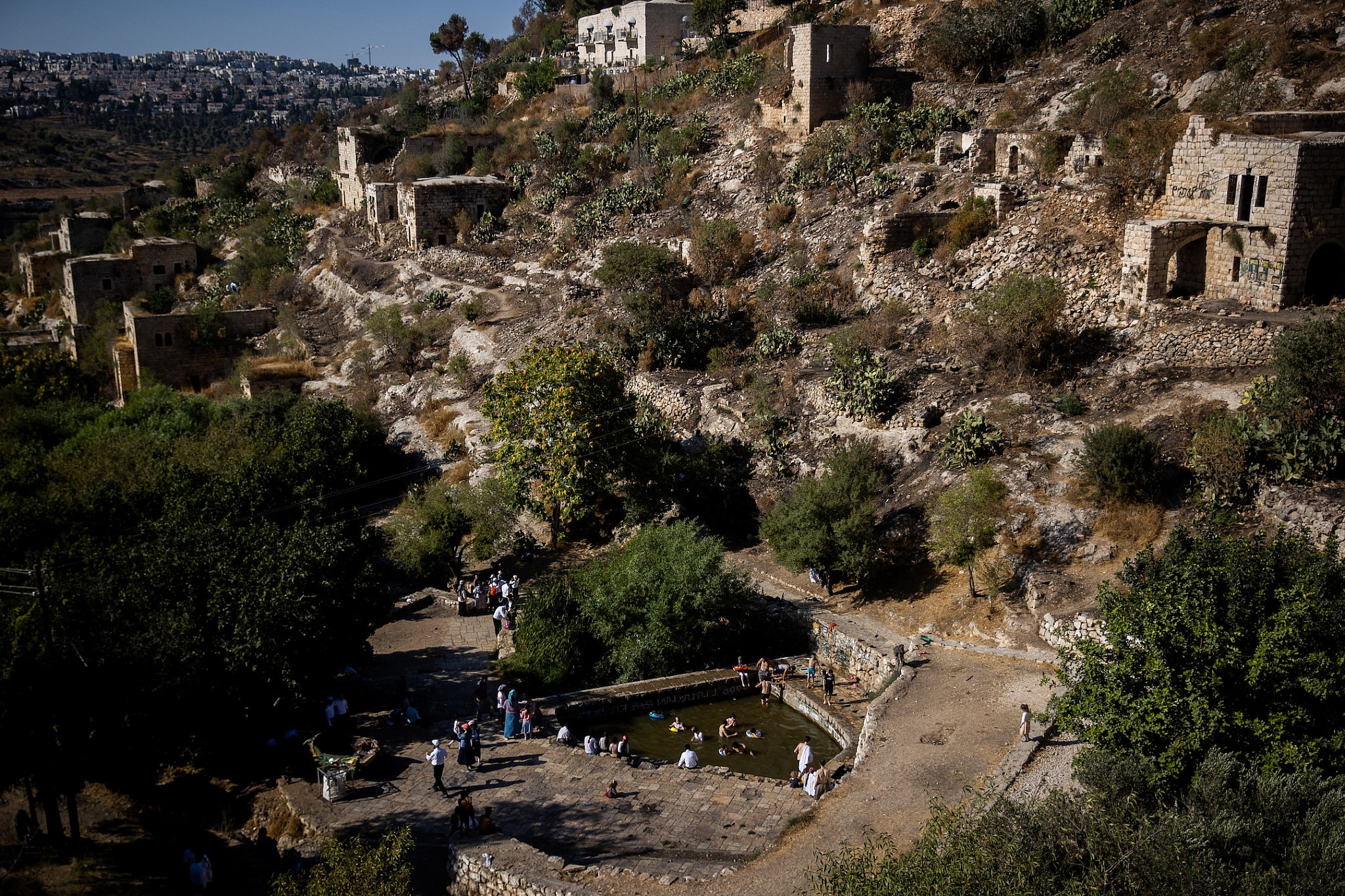 Israelis bathe in a spring in Lifta, a Palestinian village forcibly depopulated during the 1948 Nakba, on the outskirts of Jerusalem, 28 Jul 2024. (Yonatan Sindel/Flash90)